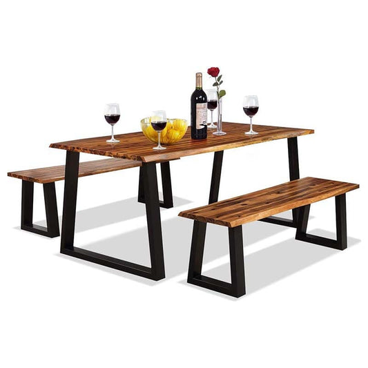 3 Pcs Rustic Acacia Wood Dining Table Set with 2 Benches, Indoor & Outdoor Picnic Table Bench with Metal Legs