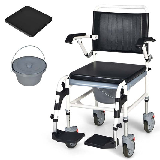4-in-1 Bedside Commode Chair Shower Wheelchair with Detachable Bucket, Padded Mobile Toilet Chair