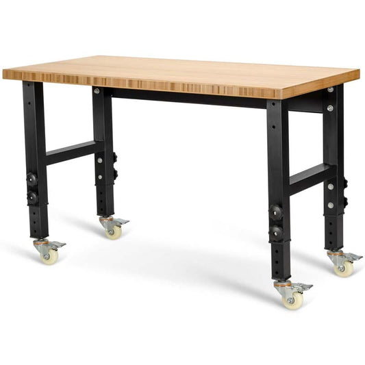 48" x 24" Bamboo Mobile Workbench with Casters, Heavy-Duty Steel Work Table Adjustable Height Workstation