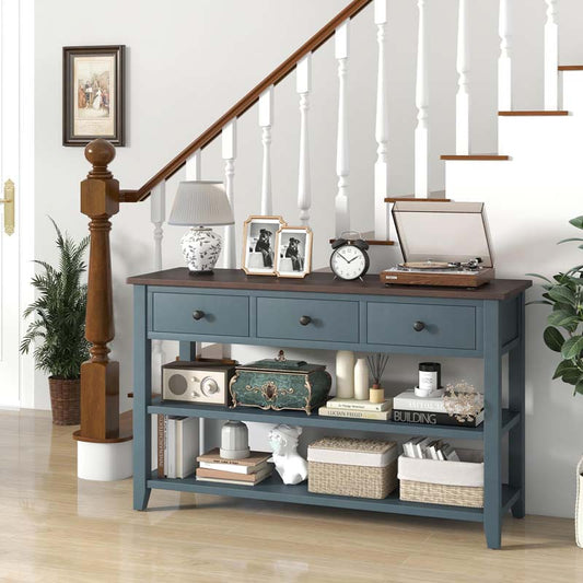50" Farmhouse Entryway Table, Narrow Console Table with 3 Storage Drawers & 2 Open Shelves, Wooden Behind Couch Side Table