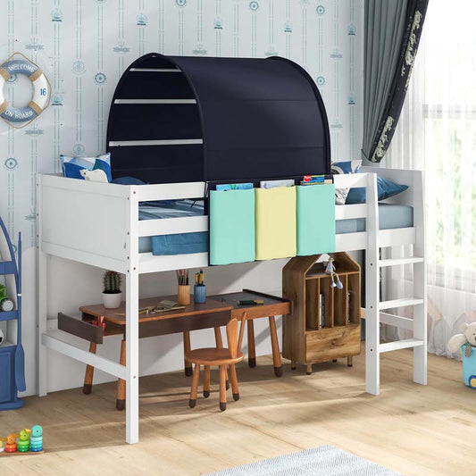 Kids Twin Size Loft Bed Playhouse Bed Frame w/Tower, Tent, 3 Storage Pockets, Solid Wood Ladder, Full-Length Guardrails & Wood Slats