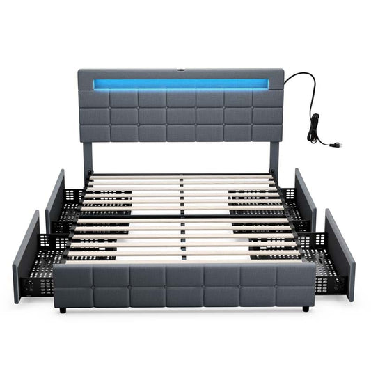 LED Upholstered Queen Bed Frame with 4 Drawers & USB Ports, Adjustable Tufted Headboard Platform Bed Frame