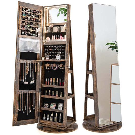 63.5"H 360 Swivel Jewelry Armoire w/Full Length Mirror, 3-Color LED lights, Rear Storage Shelves, Lockable Standing Jewelry Cabinet Organizer