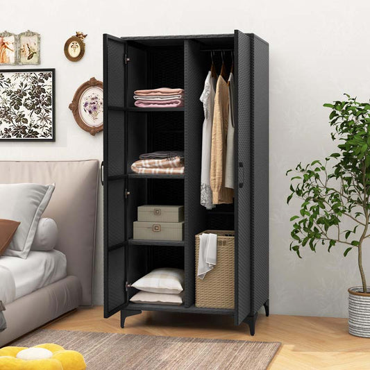 62" Tall PE Rattan Wicker Wardrobe Closet Storage Cabinet with 2 Doors, Hanging Rod, 4 Storage Cubes, Metal Legs, Anti-tipping Device