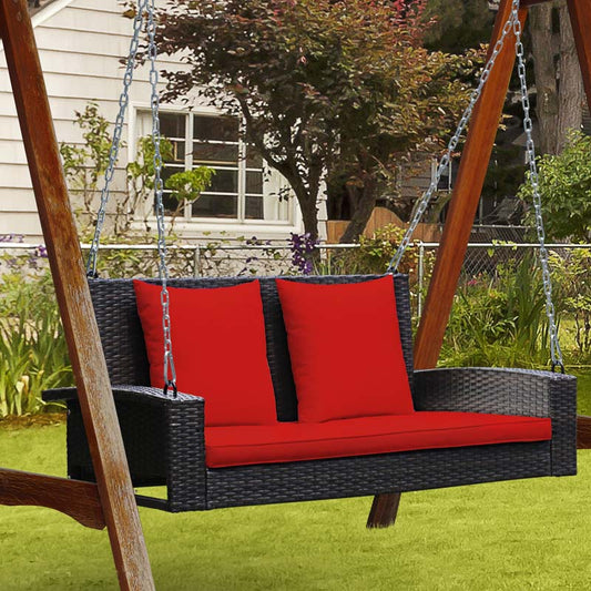 2-Person Rattan Wicker Outdoor Patio Hanging Porch Swing Bench Chair with Sturdy Steel Chain & Cushions
