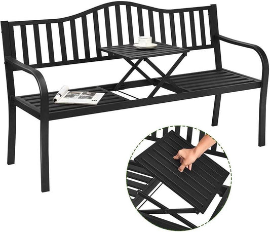 59.5" Large Outdoor Patio Metal Bench Seat with Pullout Middle Table, Weather Resistance Park Bench for Garden Porch