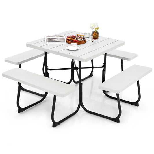 8 Person HDPE Outside Table & Bench Set, Outdoor Square Picnic Table with 4 Built-in Benches, Umbrella Hole, Metal Frame