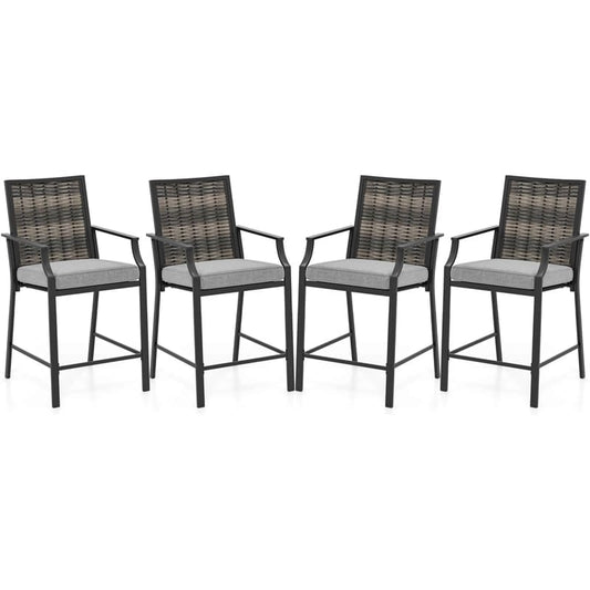 Outdoor Metal Bar Stools Set of 2 with Rattan Back, Armrest, Fabric Seat & Cushions, Counter Height Patio Bar Chairs for Poolside, Porch, Backyard