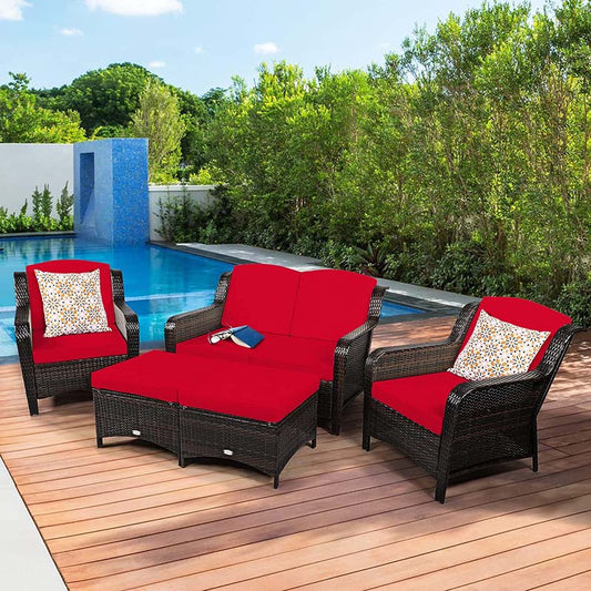 5 Pcs Rattan Wicker Patio Furniture Set with Loveseat, Single Sofas & Ottomans, Outdoor Conversation Sets