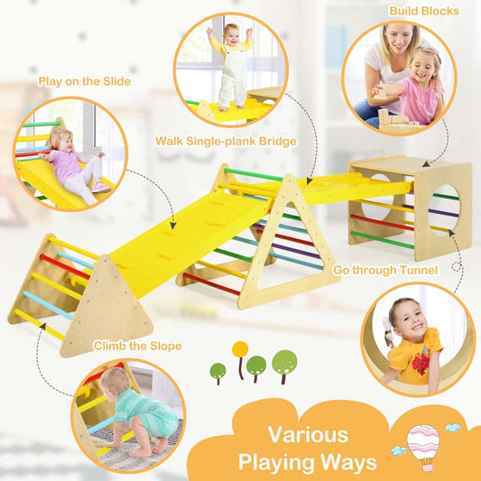 5 in 1 Kids Triangle Climber Play Gym Set with Double Sided Ramps, Indoor Toddler Wooden Climbing Toys for Playground Daycare