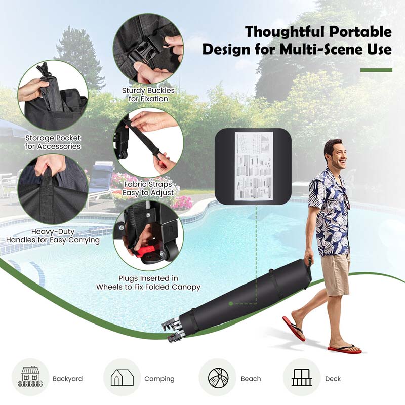 - Convenient Folding & Storage: Thanks to quick-release buttons, the frame collapses down easily without removing the canopy. It folds into a compact 1.3 ft x 0.9 ft x 5.2 ft size and fits neatly in the included zippered storage bag, which features wheels and a side pocket for accessories.