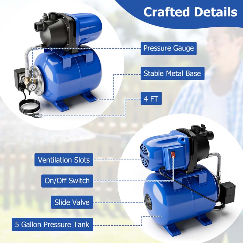 Sturdy Construction: The cast iron pump casing and tank are built for strength and corrosion resistance. An added bottom retainer stabilizes the pump during operation, minimizing shaking and reducing the risk of tipping.