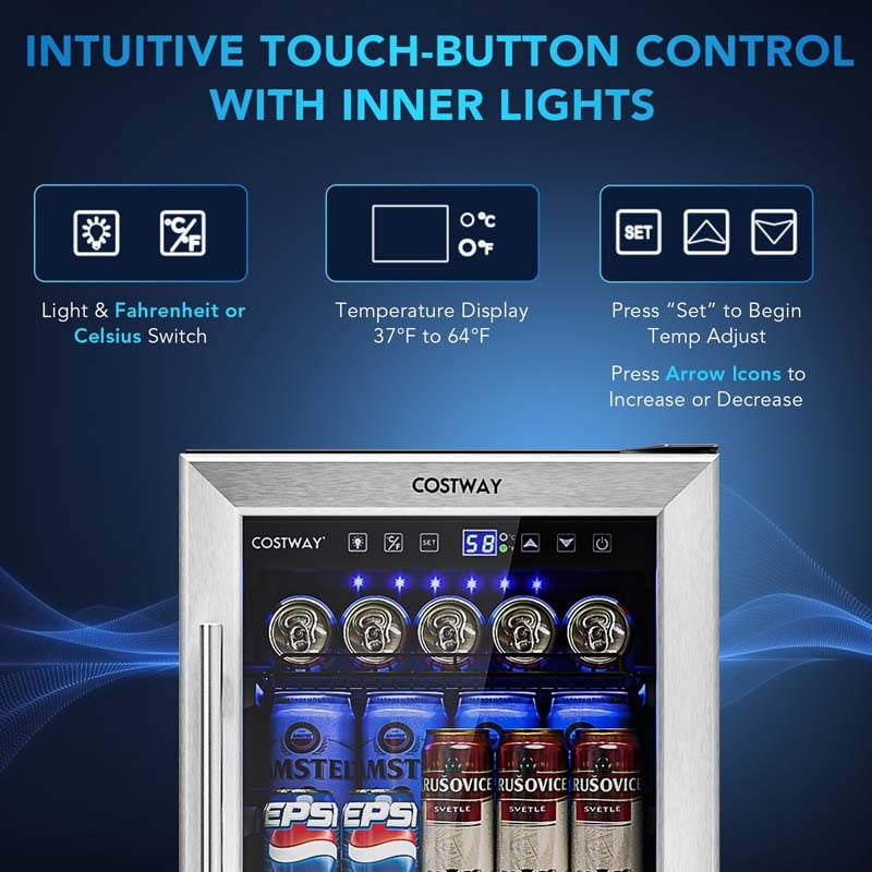 This wine and beverage cooler features a spacious interior with 3 adjustable steel wire shelves and stoppers, holding up to 100 standard-size cans. Its advanced compressor system with fan-forced cooling and auto-defrost keeps drinks chilled efficiently and quietly. The double-layer tempered glass door seals in the cold and lets you view contents easily. With built-in blue LED lighting, sleek design, and a lockable door, this fridge offers style and security. It fits seamlessly under standard counters and is easy to control with an intuitive touch panel and LCD screen—perfect for your kitchen, game room, or bar.