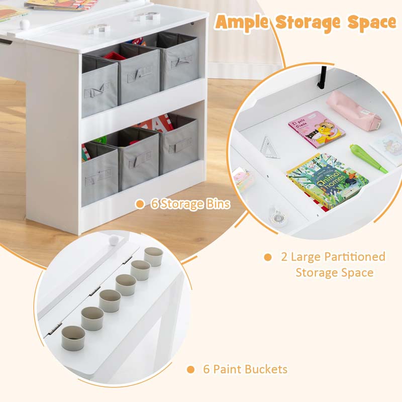 Ample Storage: Equipped with 6 canvas bins and 4 paint cups, this set keeps art supplies organized and within reach. Two compartments under the table provide space for books or artwork.