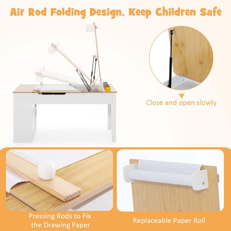 2-in-1 Convertible Design: The tabletop lifts with a smooth air-rod mechanism to double as an easel—no need for a separate unit. The set includes 2 chairs and a 10-meter paper roll, perfect for creative activities with friends.