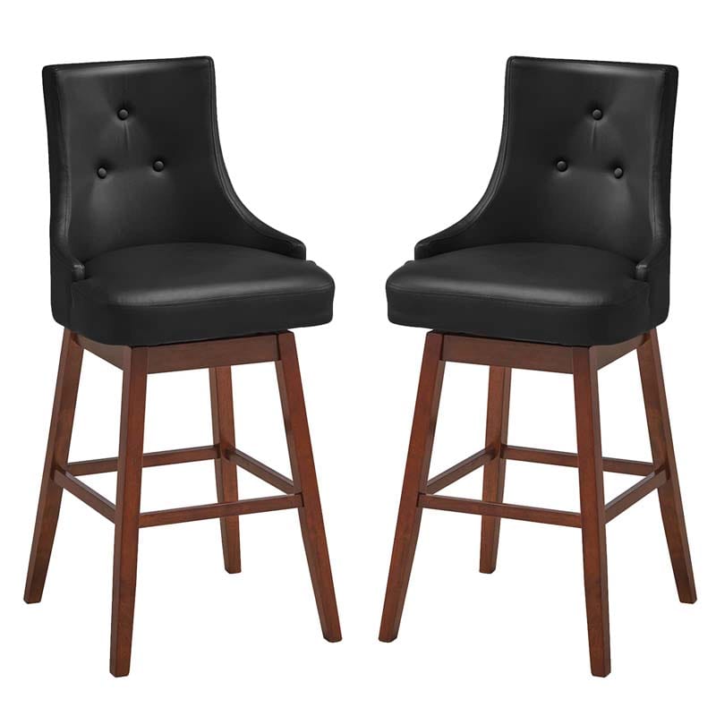 Enhance your home with this modern swivel bar stool set, a perfect blend of classic tones and contemporary aesthetics. Designed with a tufted backrest and soft PVC leather upholstery, these stools offer both decorative appeal and cozy comfort. The foam-padded seat provides a plush sitting experience, while the ergonomically curved back and convenient footrests ensure full relaxation. Ideal for socializing at your kitchen island or dining space, the 360° swivel function lets you turn and chat without having to move the stool.