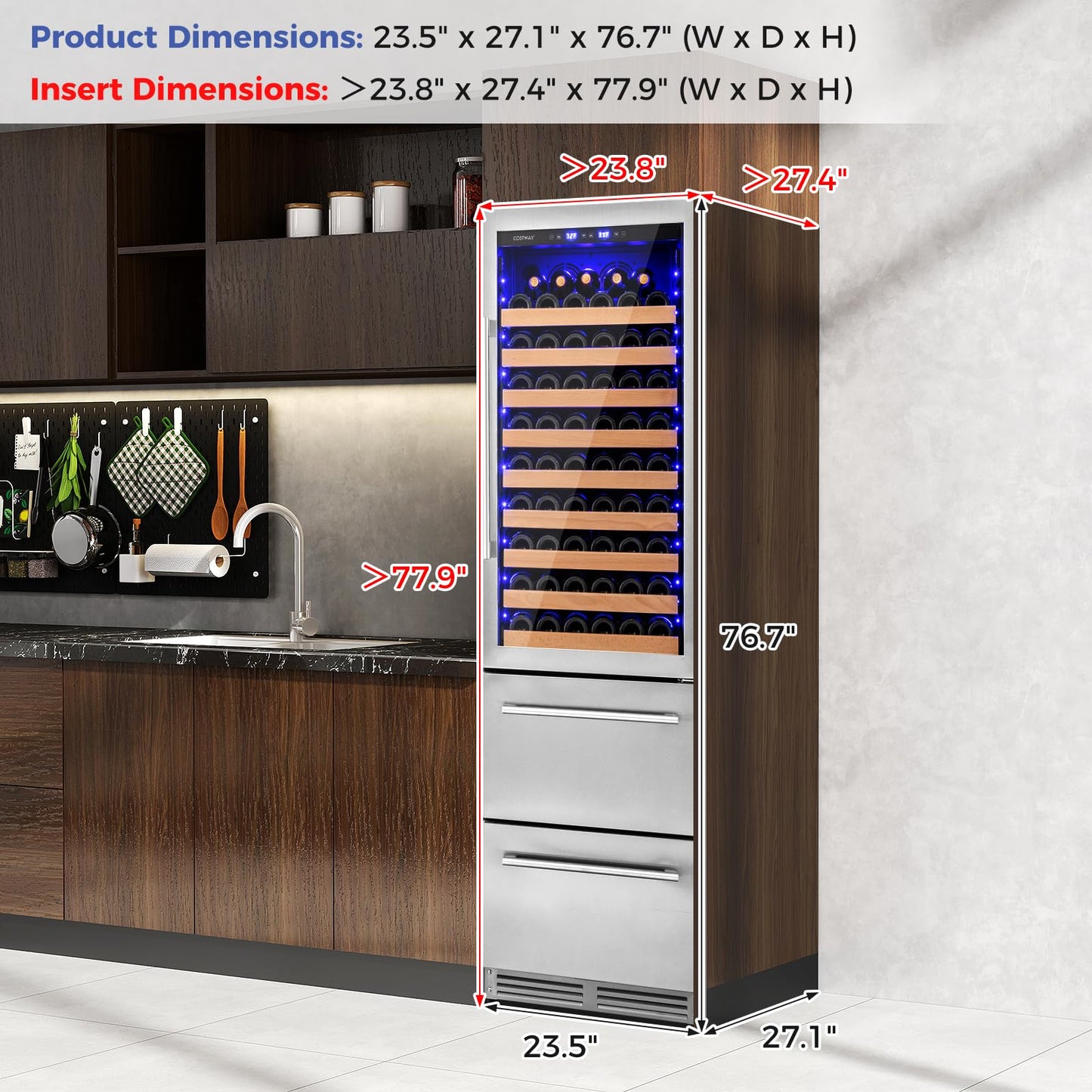 Designed with your space in mind, this freestanding and built-in compatible fridge fits perfectly under counters or stands proudly in your bar area. The reversible door on the upper section allows for seamless adaptation to your kitchen or entertainment layout. With recommended recessed dimensions of >23.8”W x 27.4”D x 77.9”H, this unit integrates smoothly into any high-end setup.