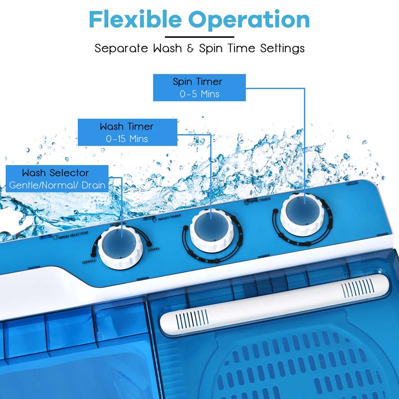 - Independent Timer & 3 Wash Modes: Control your laundry with separate washer and spinner timers—up to 15 minutes for washing and 5 minutes for spinning. Choose from gentle, normal, and drain modes to handle everything from delicates to heavy loads.