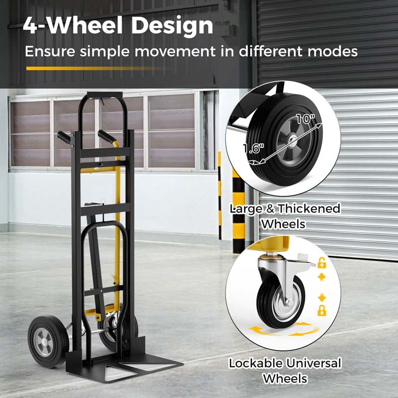 - Smooth & Stable Rolling: Equipped with four wheels, two of which are large 10" thickened wheels for easy movement in all modes, and two lockable universal wheels to secure the dolly when needed.