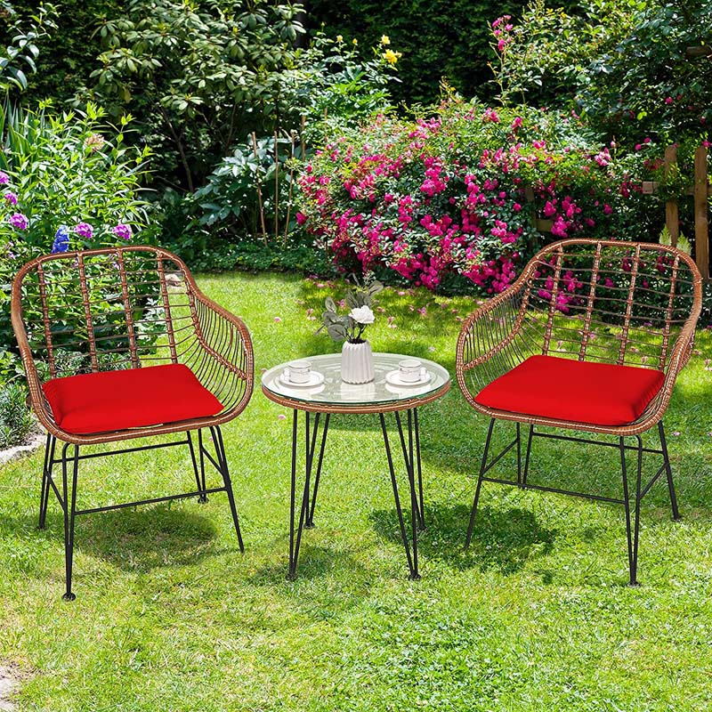 This 3-piece patio bistro set combines a sleek design with functionality, bringing a touch of elegance to your outdoor or indoor space. Compact and lightweight, it’s easy to reposition and ideal for areas with limited space like apartments, hotel balconies, or office lounges. The smooth rattan surface is low-maintenance and simple to clean. Built from quality rattan and a strong metal frame, this set is made to last. The tempered glass tabletop offers a handy surface for placing snacks, books, or drinks. With soft seat cushions and a cozy seating layout, this rattan furniture set is perfect for relaxing with friends outdoors.