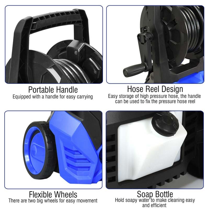 Built-In Hose Reel and Easy Mobility: Two large wheels and a comfortable top handle make transport easy. The built-in hose reel helps organize and protect the 26 ft high-pressure hose, simplifying setup and storage.