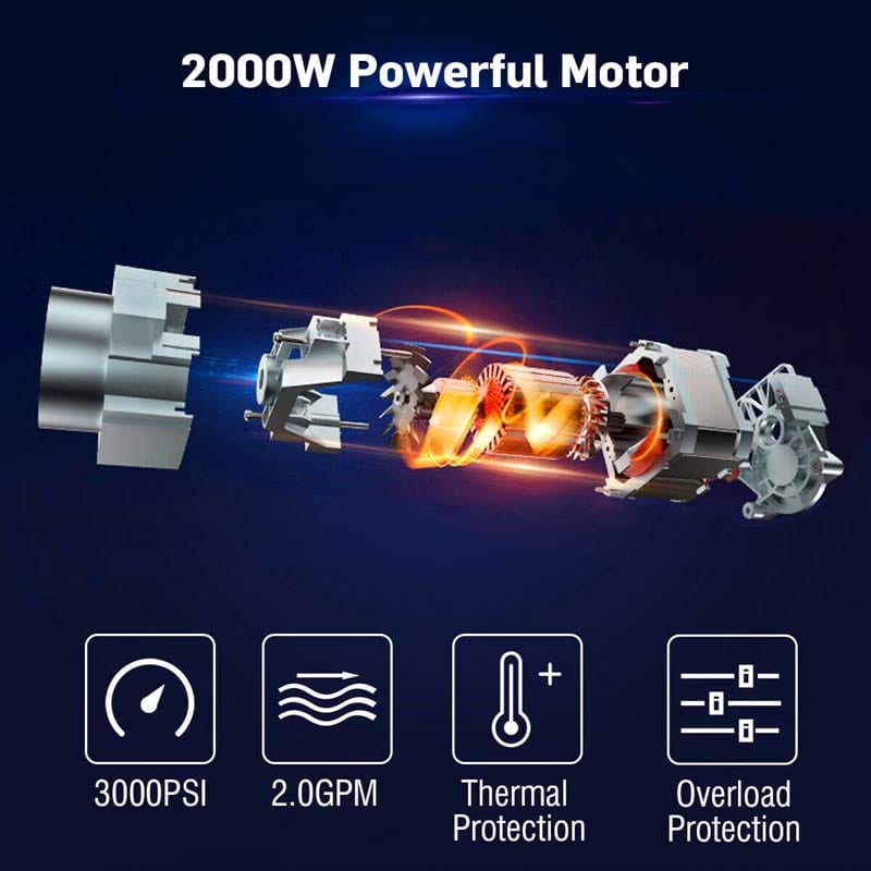 Powerful 2000W Motor for Deep Cleaning: Generates up to 3000 PSI and 2.0 GPM to easily remove dirt, mud, and grime from a variety of surfaces—ideal for cleaning driveways, siding, vehicles, decks, and more.