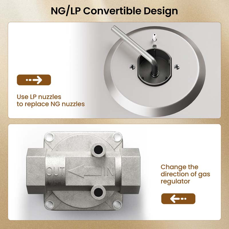 - Convertible for NG or LP Use: Designed for versatility, the cooktop easily converts from natural gas to liquid propane with the included conversion kit; simply change the nozzles and adjust the regulator as needed.