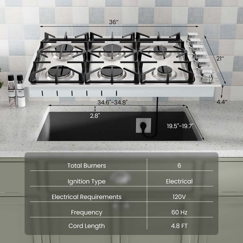 - Multiple Burners for Fast Cooking: The 30" model includes 4 burners (2 at 9000 BTU/H, 1 at 12000 BTU/H, and 1 at 18000 BTU/H), while the 36" model offers 6 burners (2 at 6000 BTU/H, 2 at 12000 BTU/H, and 2 at 18000 BTU/H), allowing you to cook various dishes simultaneously with optimal heat.