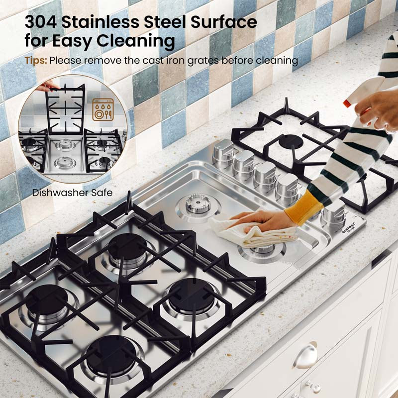 - Easy Cleaning and Maintenance: The stainless steel surface can be quickly wiped down with a damp cloth, while the cast iron grates can be placed in the dishwasher to save cleaning effort and keep your kitchen tidy.