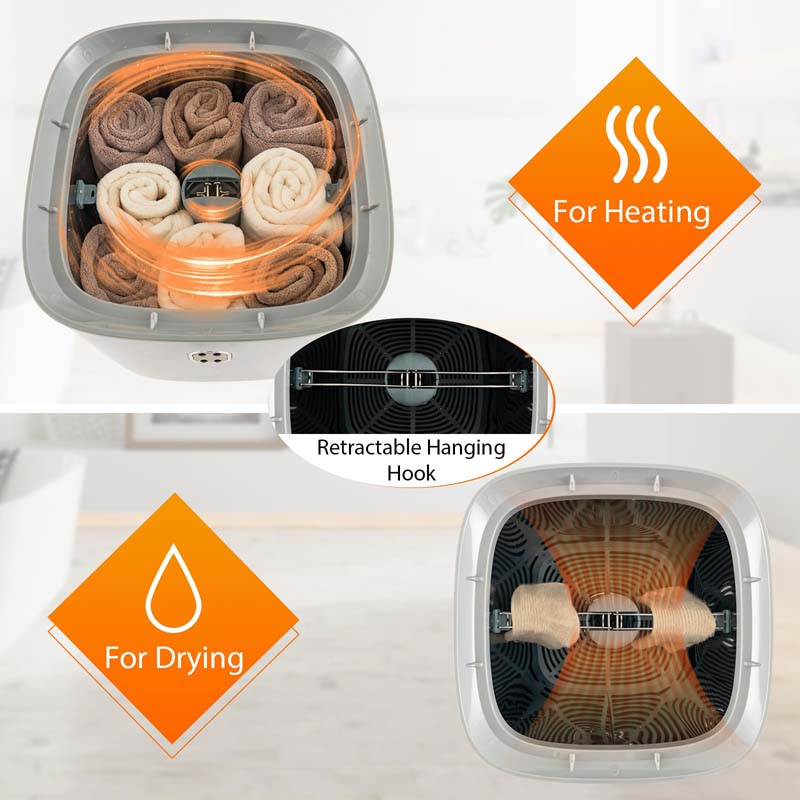 Our towel dryer features a powerful heating system that ensures quick and consistent warmth throughout. Made with durable stainless steel 430 for the inner liner, it resists rust and discoloration even with extended use. Specifically built for drying towels, it includes a built-in tray to catch dripping water. The design is also perfect for small garments—cylindrical supports with hooks inside let you dry items like socks and underwear with ease. With an upgraded 35L capacity, it fits several towels or even a blanket. For added safety, the outer ring is made of flame-retardant PC, and the tough PP body enhances durability. You can set the heat duration from 20 to 90 minutes, and the drying time between 2 and 5 hours depending on your fabric needs.