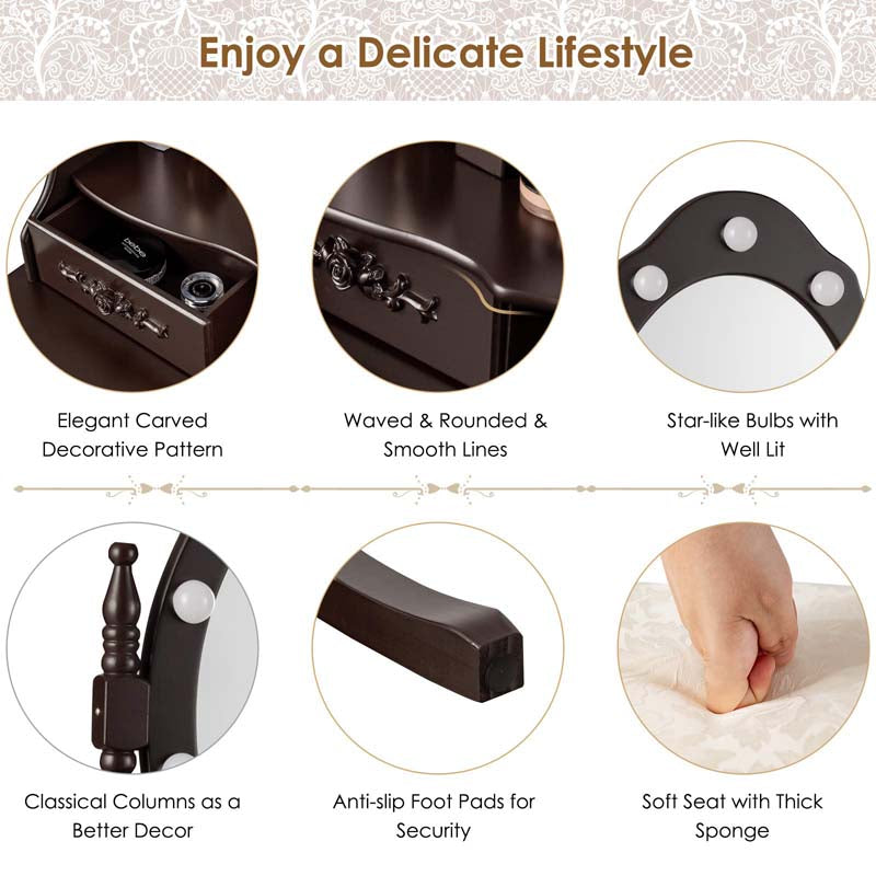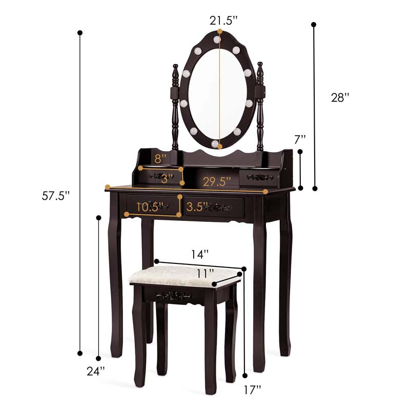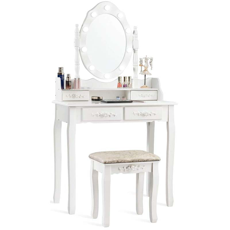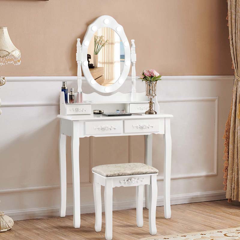 Designed with 10 brilliant LED bulbs around a 360° swivel mirror, this vanity table lets you apply makeup with precision—even in low light. The classic silhouette features graceful detailing, including smooth lines, rose-shaped drawer knobs, and a clean finish that adds charm without being over the top. With four drawers and a spacious tabletop, this vanity offers generous storage for all your beauty and personal items, keeping everything within easy reach.
