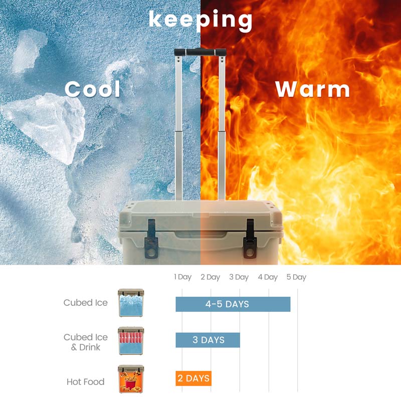 - Superior Insulation Performance: Constructed with thick PU insulation, it keeps ice solid for 3–5 days when fully packed with ice, or 3 days with drinks, and can maintain hot temperatures for up to 2 days. The food-grade LLDPE liner and sealing gasket help lock in temperatures longer. (To maximize effectiveness, ensure a consistently low internal temperature.)