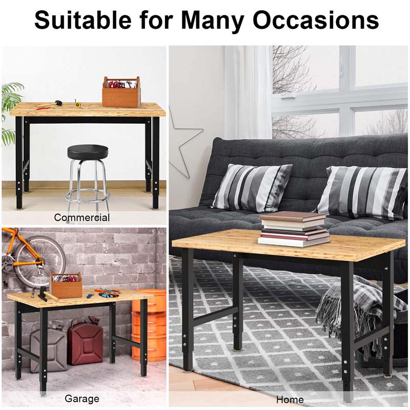 This multi-functional, heavy-duty workbench is designed to serve multiple purposes in different environments such as your garage, home, or workshop. With a strong load-bearing capacity, it ensures safe use even for intensive tasks. Its height-adjustable feature offers enhanced practicality, with 15 customizable height settings ranging from 28.5 inches to 42 inches—perfectly adaptable to different chair heights or project requirements. The worktop is crafted from high-quality bamboo, delivering exceptional stability and long-term durability.