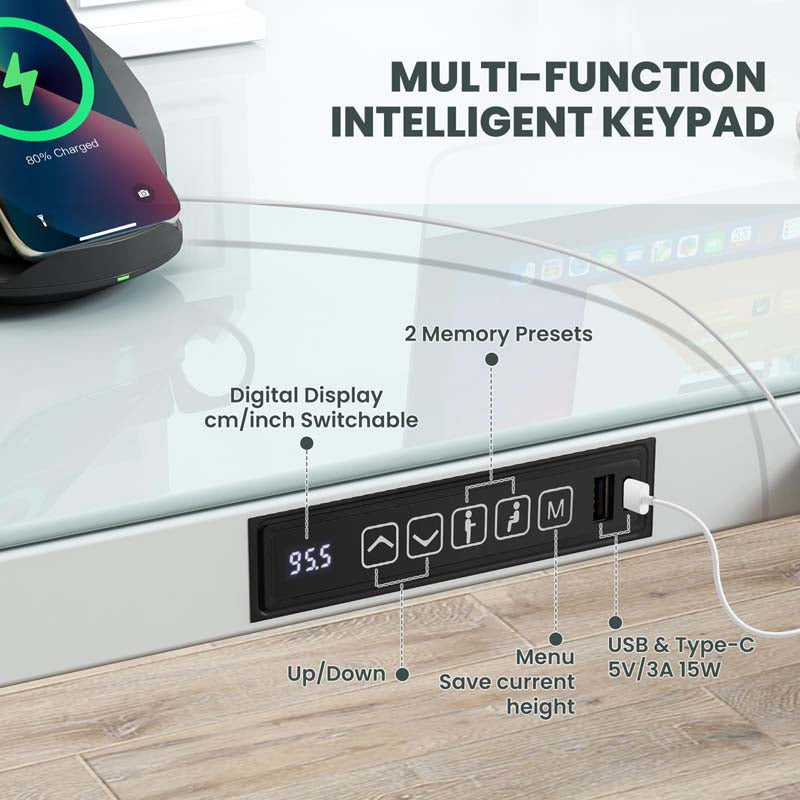 Stay in control with the multi-function intelligent keypad, featuring a digital height display, up/down buttons, and 2 memory presets for quick adjustments. Integrated USB and Type-C ports let you charge devices directly from your desk, cutting cable clutter and boosting efficiency.