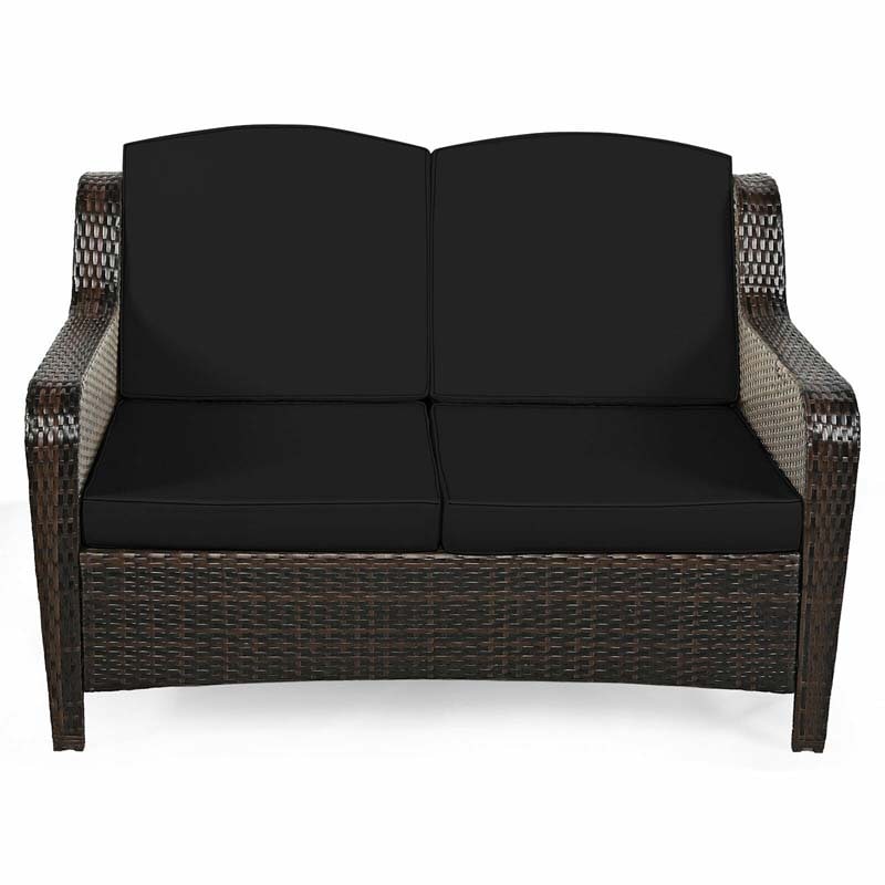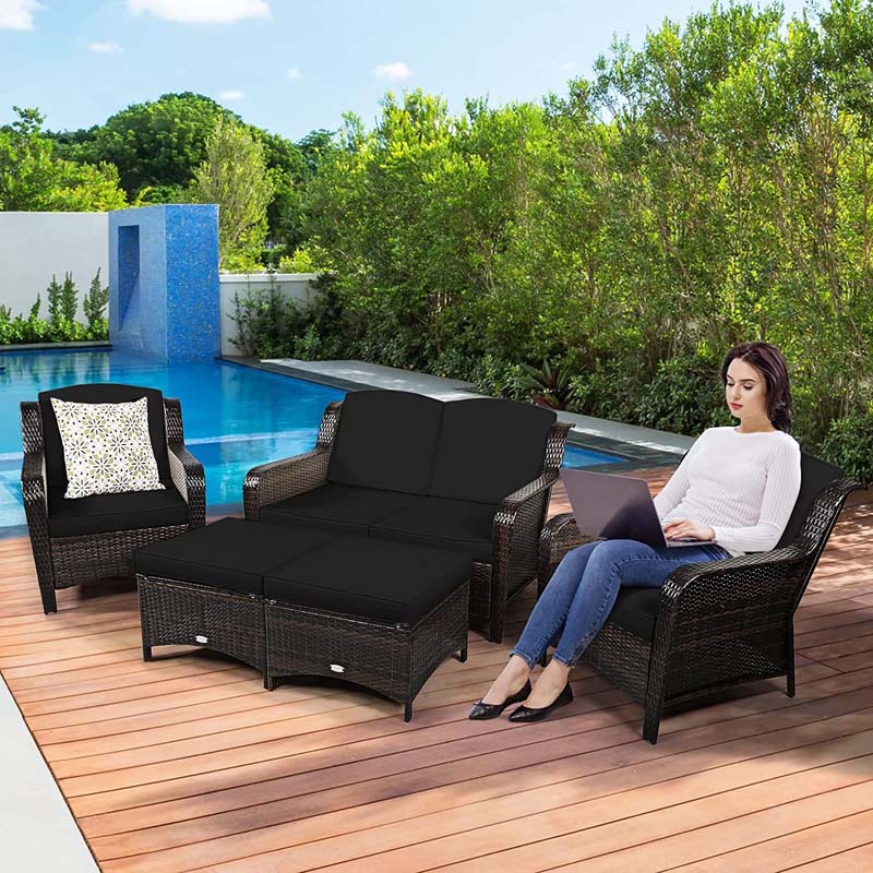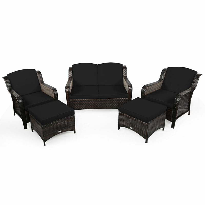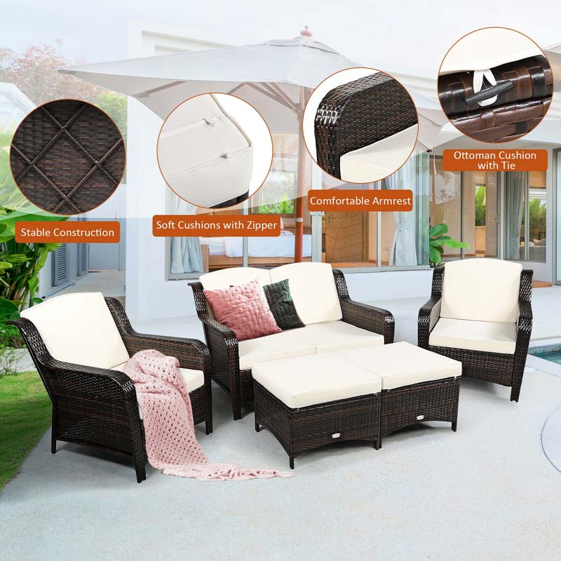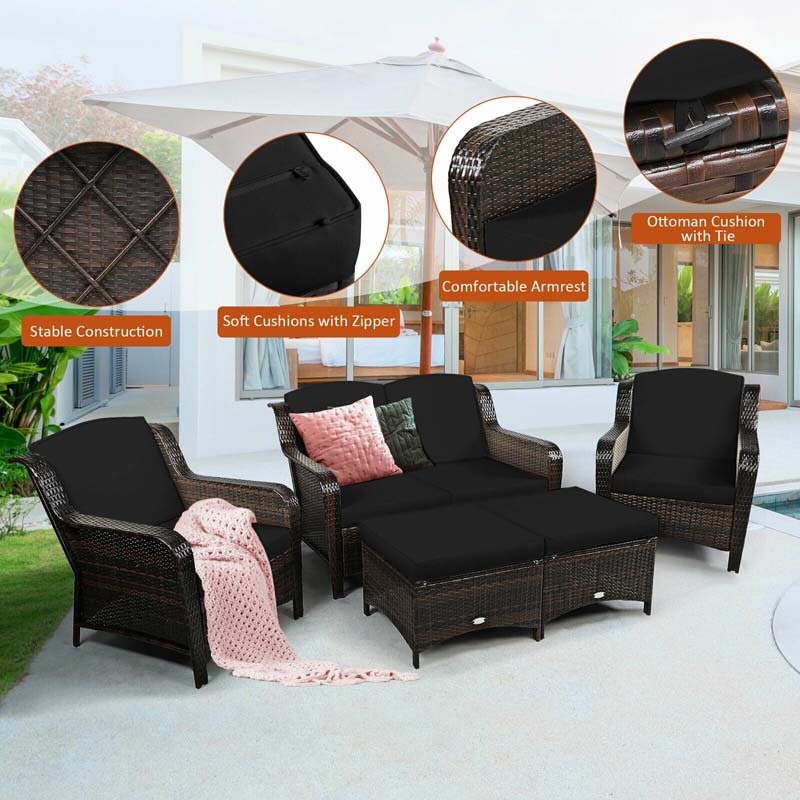 5 Pcs Rattan Wicker Patio Furniture Set with Loveseat, Single Sofas & Ottomans, Outdoor Conversation Sets