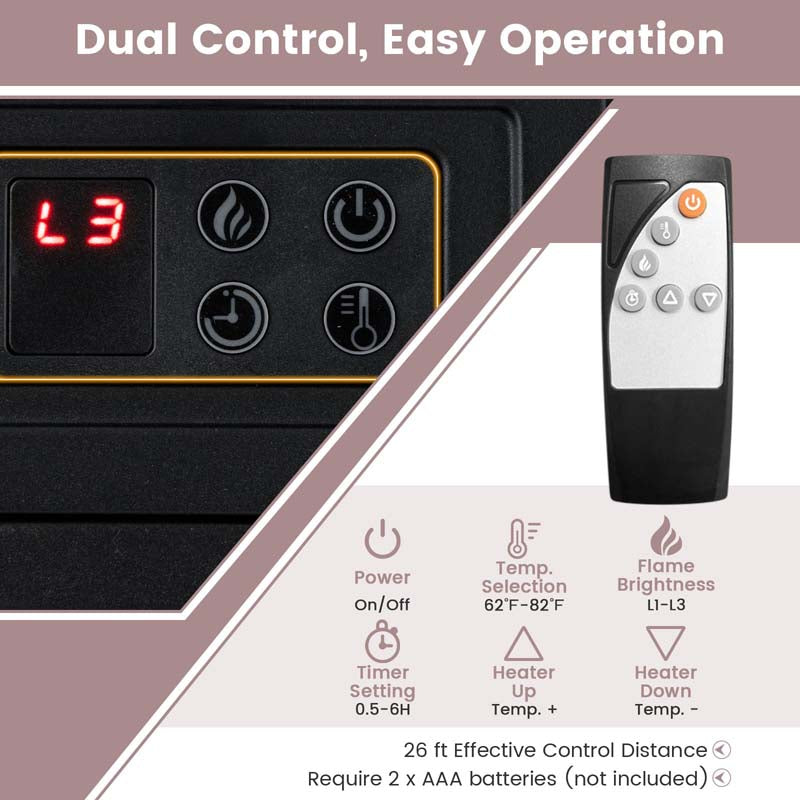 Convenient Dual Controls: Easily operate the fireplace using the built-in control panel or the included remote (2 AAA batteries required, not included). Adjust the temperature from 62°F to 82°F, set the 0.5–6 hour timer, change flame brightness, and more—all from up to 26 ft away.