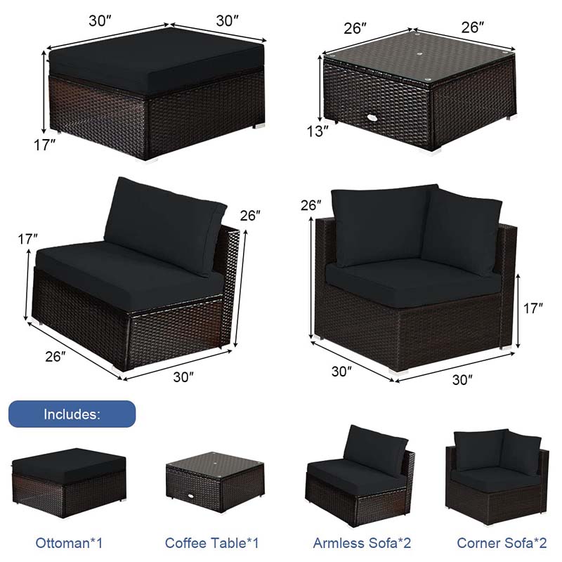 - Set Dimensions & Weight Capacity: Includes 2 corner sofas, 2 armless sofas, 1 ottoman, and 1 coffee table. Corner sofa: 30" x 30" x 26", 360 lbs capacity. Armless sofa: 26" x 30" x 26", 360 lbs capacity. Ottoman: 30" x 30" x 17", 360 lbs capacity. Coffee table: 26" x 26" x 13", 110 lbs capacity.