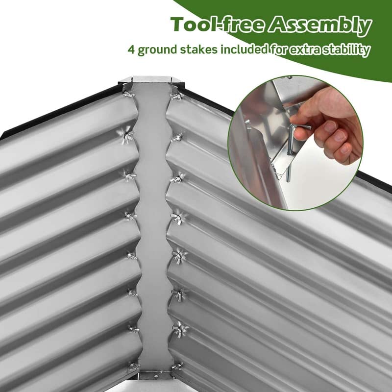 Ideal for growing herbs, vegetables, flowers, or succulents, this spacious planter adds a vibrant and modern touch to your outdoor space—whether it’s a yard, garden, or patio. Built with durable metal panels, reinforced connectors, corner protectors, and ground stakes, it ensures excellent stability and long-term use. The top edge is wrapped in rubber for added safety. Plus, its open-bottom design supports healthy root development and allows for proper drainage and nutrient absorption.