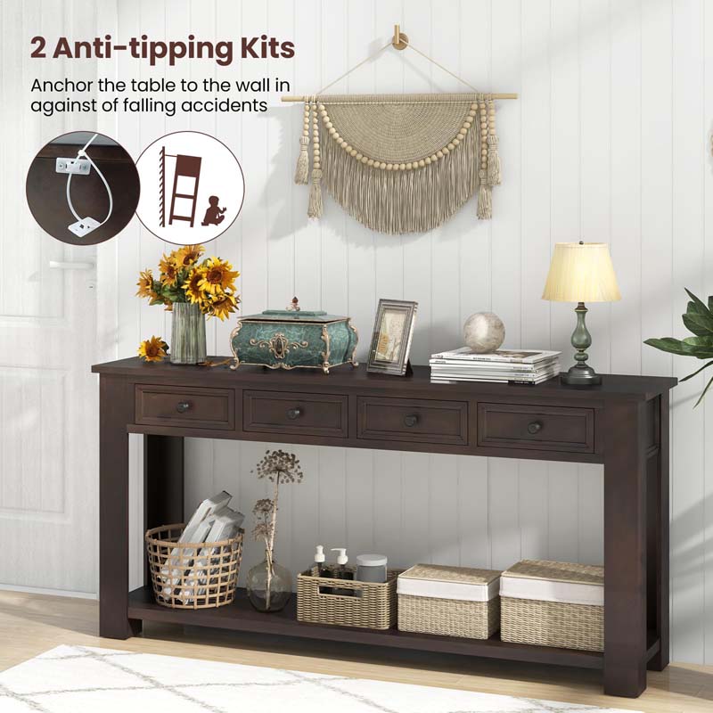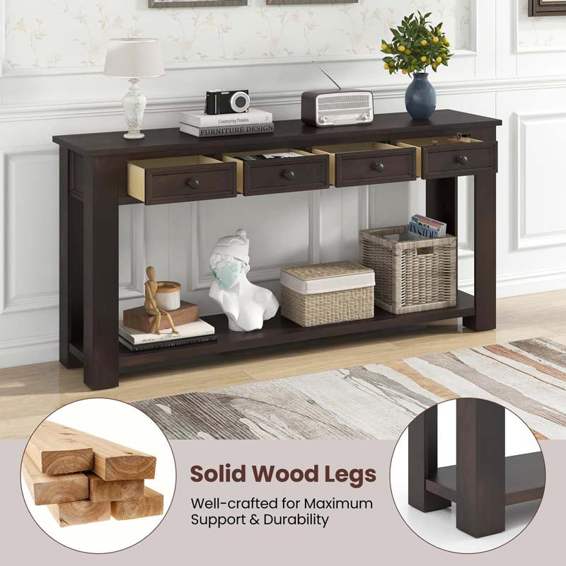 63" Farmhouse Entryway Table, Narrow Console Table with 4 Storage Drawers & Open Shelf, Rustic Long Sofa Table, Wooden Behind Couch Side Table