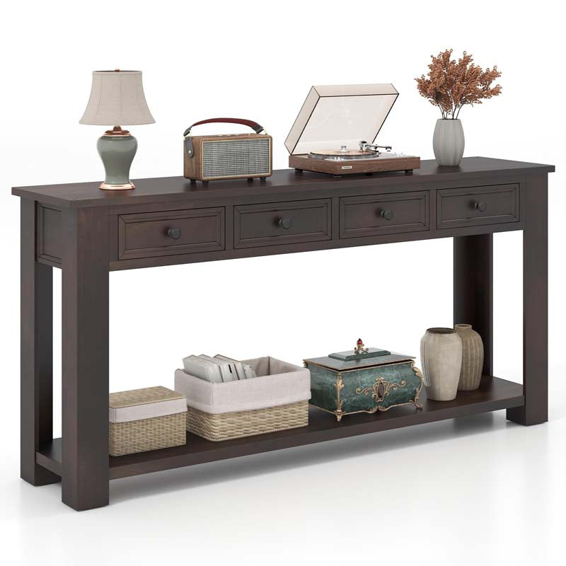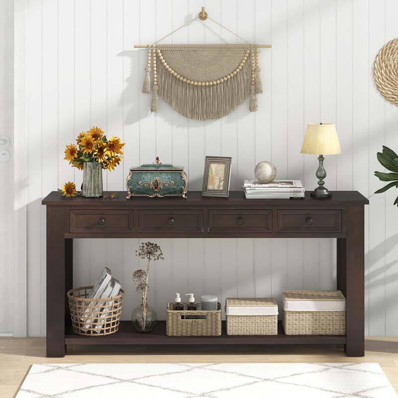 Showcase your favorite décor on the spacious tabletop, while 4 smooth-gliding drawers keep smaller items like keys, remotes, or mail out of sight. The bottom open shelf offers additional space for books, baskets, or shoes.