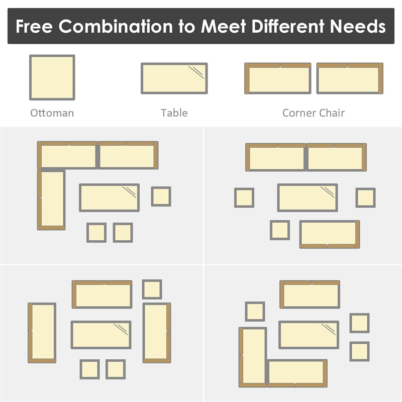 Modular Design for Flexible Arrangement: With 3 corner chairs, 3 ottomans, and 1 table, this set can be configured to match your space and gathering size. Its clean, modern design complements any outdoor or indoor setting.