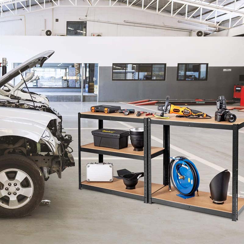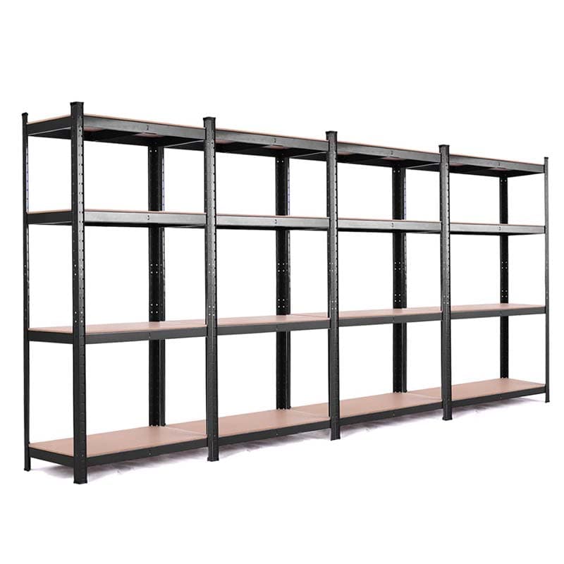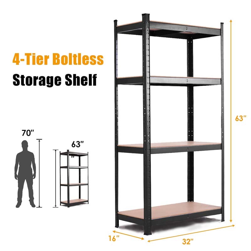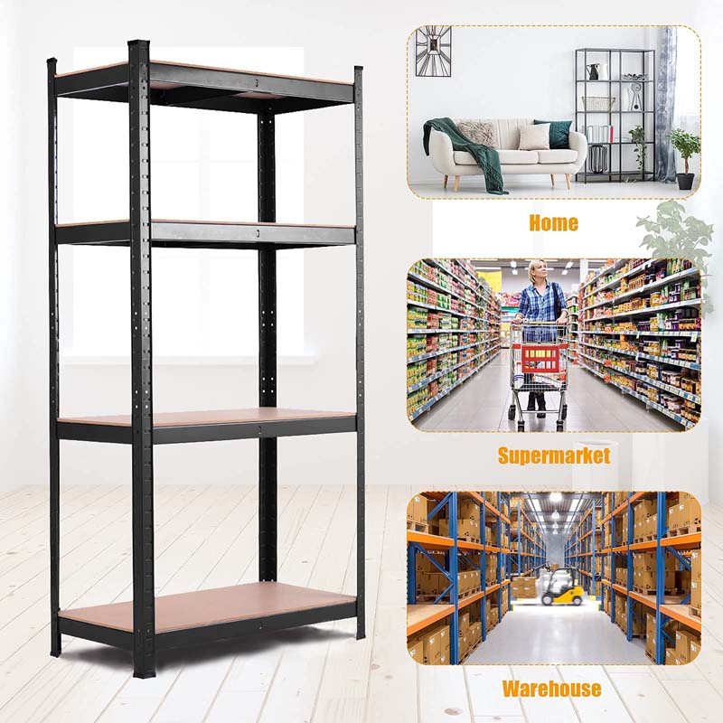 This 4-tier heavy-duty storage rack is extremely useful in organizing your tools, foods, books, or other items. The powder-coated metal construction is sturdy and resistant to rust and corrosion with regular use. The black coating also enhances its overall appearance. You can adjust the height of each shelf according to your storage needs. This flexible and space-saving muscle rack is ideal for compact areas while still offering ample storage capacity, making it perfect for bathrooms, entryways, garages, kitchens, pantries, laundry rooms, offices, or closets.