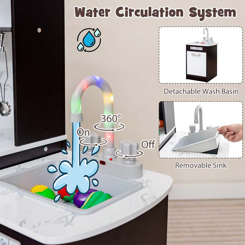 - Interactive Sink with Circulating Water: Comes with a detachable sink and rotary faucet featuring light and sound effects for a fun hand-washing or veggie-rinsing experience. (Requires 2 AAA batteries, not included.)