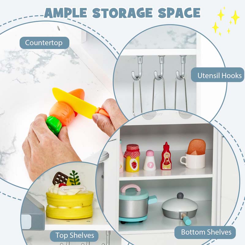 - Smart Storage Features: Includes utensil hooks, a side hook for hanging aprons, an upper shelf, and two lower shelves—encouraging kids to keep their play area tidy and organized.