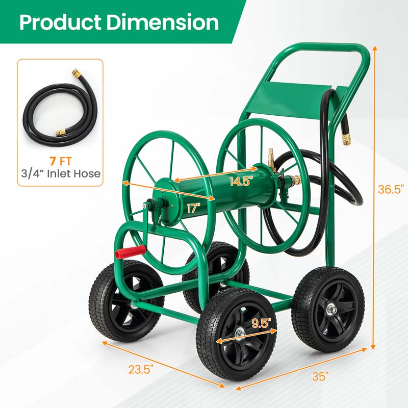 Built for durability and performance, our garden water hose cart features a rugged metal frame with a protective powder-coated finish, ensuring it resists rust and wear over time. With strong brass connectors and sturdy fasteners, it’s made to handle frequent use in any outdoor setting. The high-capacity reel holds up to 330 ft of 3/4" or 5/8" hose, or 400 ft of 1/2" hose (hose not included), and comes with a 7 ft lead-in hose for convenience. Whether you're watering your garden, cleaning vehicles, or irrigating crops, this cart is designed to make the job easier with its ergonomic handle, stable wheels, and easy-to-use crank system.
