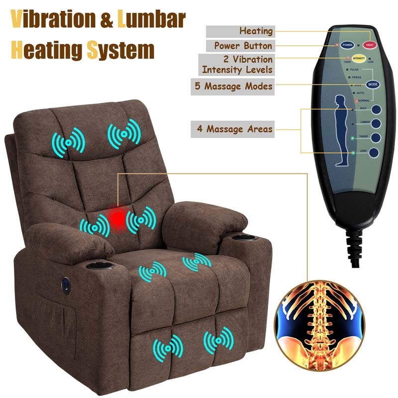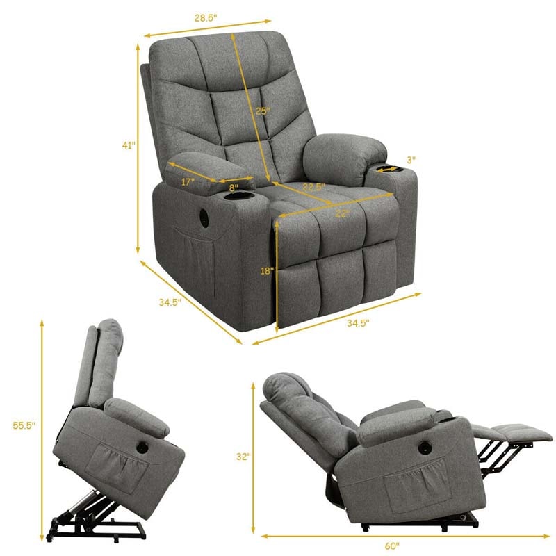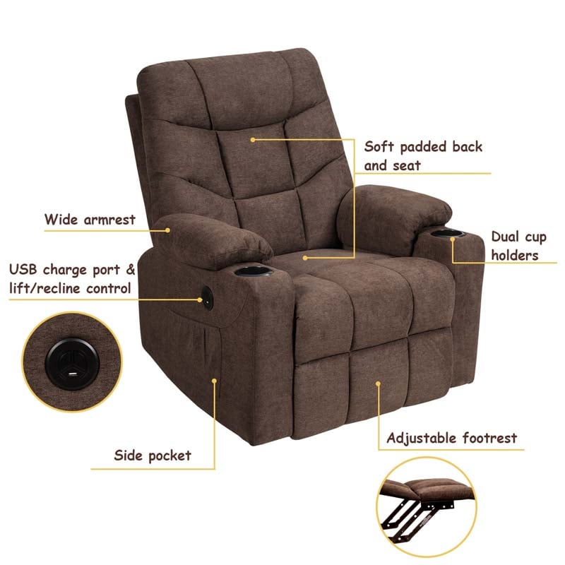 This power lift massage recliner chair is designed with a lift function, lumbar heat, 8 vibration points, 5 massage modes, and 2 intensity settings—offering complete relaxation tailored to your needs. The electric lift mechanism helps seniors stand up or recline smoothly and safely. Generously padded with an extended footrest, wide armrests, plush backrest, and thick cushions, this chair ensures excellent comfort. Built with a durable frame, it supports up to 330 lbs. It also features dual cup holders, side storage pockets, and a USB charging port for added convenience. The soft, wear-resistant linen cover is comfortable and durable, making this recliner perfect for the living room, bedroom, office, or home theater.