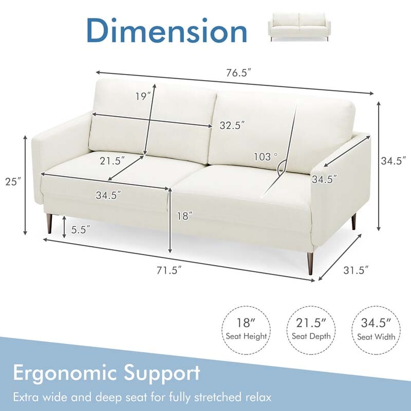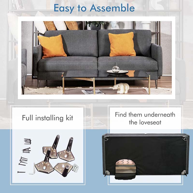 Perfectly blending style and function, this 2-seat sofa offers a clean-lined design that fits seamlessly in compact areas. Upholstered with breathable fabric, it delivers a soft, skin-friendly feel. The CertiPUR-US certified high-density sponge ensures long-lasting comfort, while the elastic spring system adds to durability. Built with sturdy metal legs, this loveseat supports up to 500 lbs and provides reliable seating. Its slanted backrest design promotes a more ergonomic posture. Assembly is quick and simple, with all parts conveniently stored beneath the seat.