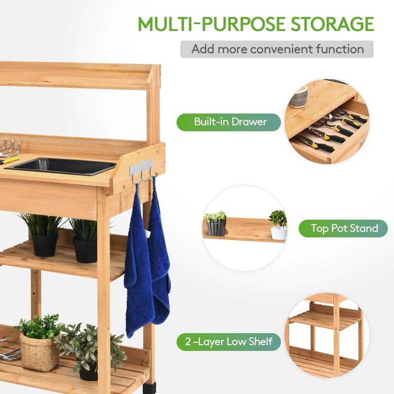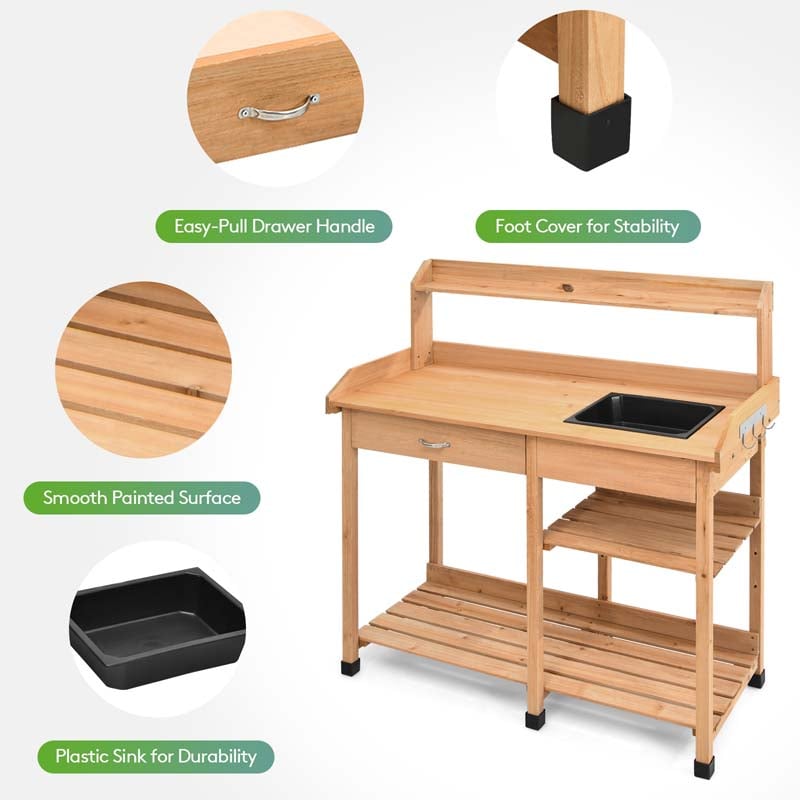 Outdoor Patio Potting Bench Table with Sink, Drawer, Shelves & Hooks, Fir Wood Garden Work Bench Workstation