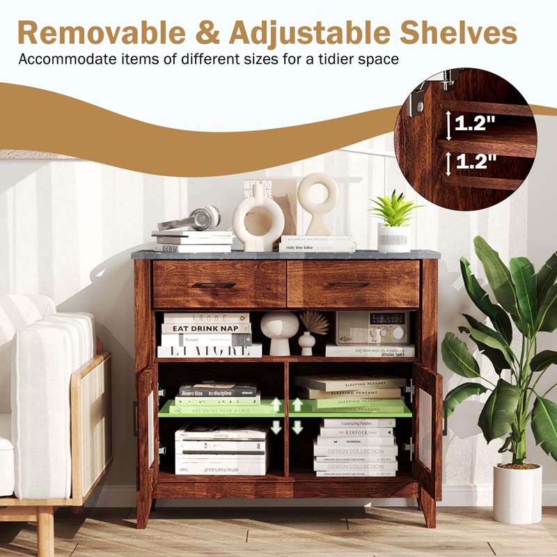 Upgrade your dining area, kitchen, or hallway with this buffet sideboard, a perfect blend of practicality and style. Its spacious faux marble tabletop is ideal for displaying decorative accents, serving dishes at family gatherings, or simply placing your coffee maker or microwave. The unit features 2 smooth-gliding drawers, 2 concealed cabinets, and a large open shelf—all designed to organize your kitchenware, coffee supplies, or serving essentials in one accessible place.
