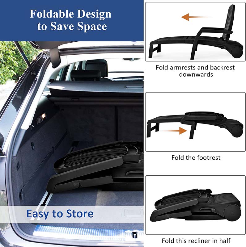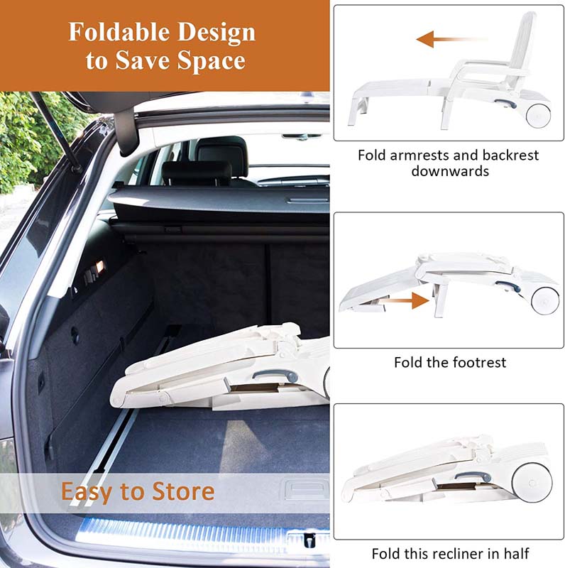 This recliner folds down in under a minute for easy storage. Two smooth wheels make it simple to transport from one place to another. A built-in storage compartment behind the backrest offers convenient space for everyday items.